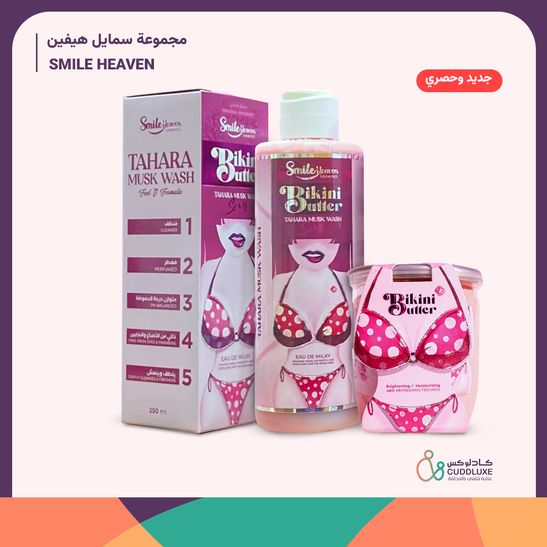 ✨ استمتعي بعناية فاخرة ومتكاملة مع مجموعة هيفين سمايل، الحل الأمثل لتفتيح، ترطيب، وتعطير منطقة البكيني والمناطق الحساسة 🌸.