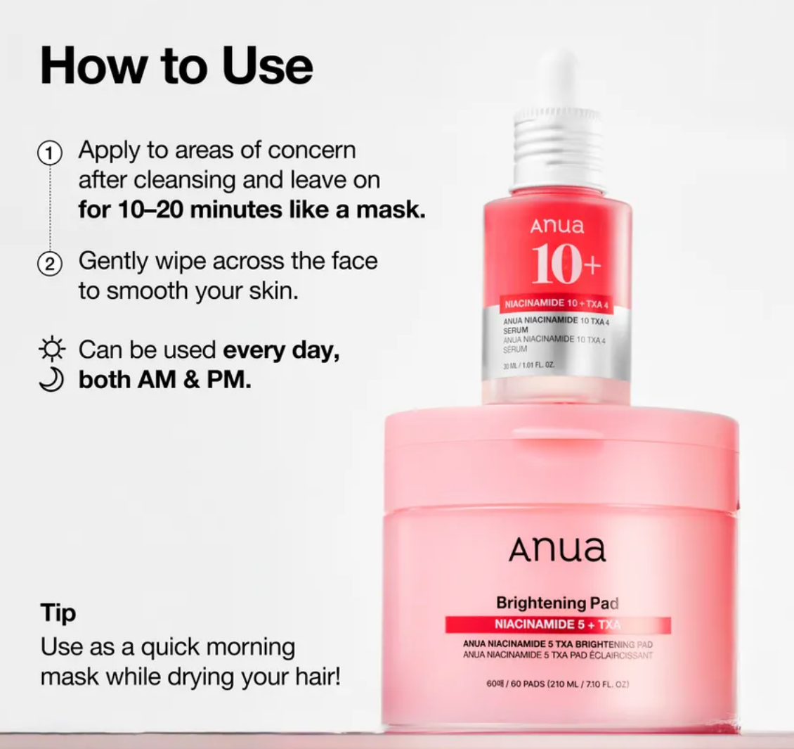 2️⃣ أنوا بادز لتفتيح البشرة (Niacinamide 5 + TXA Pads) – وسادات قطنية مشبعة بمكونات مهدئة ومفتحة، تنظف المسام بعمق وتعيد للبشرة ملمسها الناعم والمشرق.