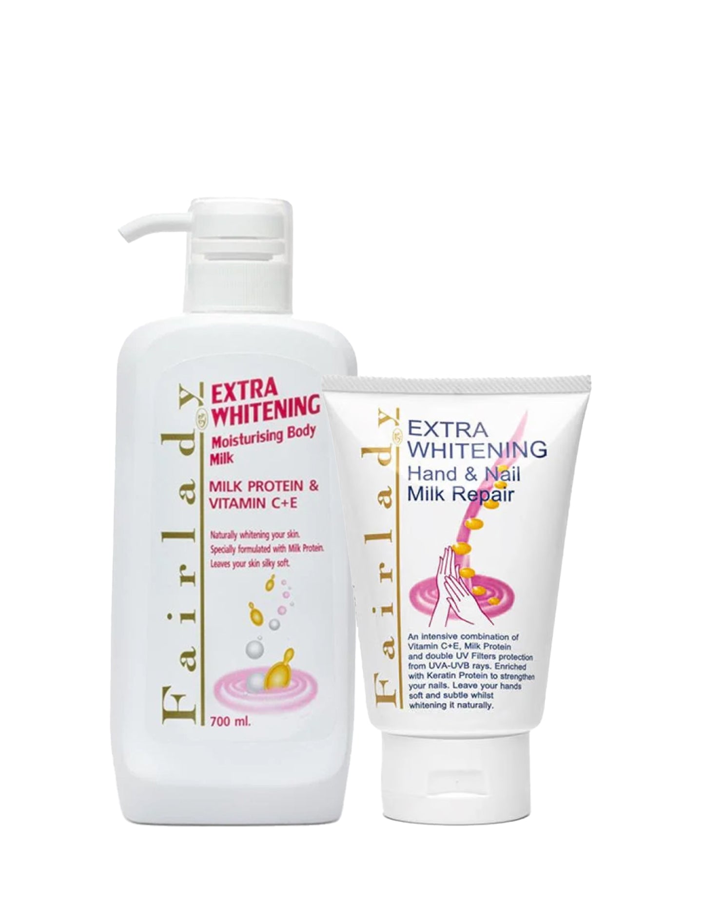 مجموعة Fair Lady لتفتيح اليدين والجسم تمنحك عناية شاملة بفضل تركيبتها الغنية ببروتين الحليب، فيتامين C، فيتامين E، والكيرياتين. صممت خصيصًا لتفتيح البشرة، ترطيبها وتغذيتها من العمق، لبشرة ناعمة، مشرقة وشابة يومًا بعد يوم.