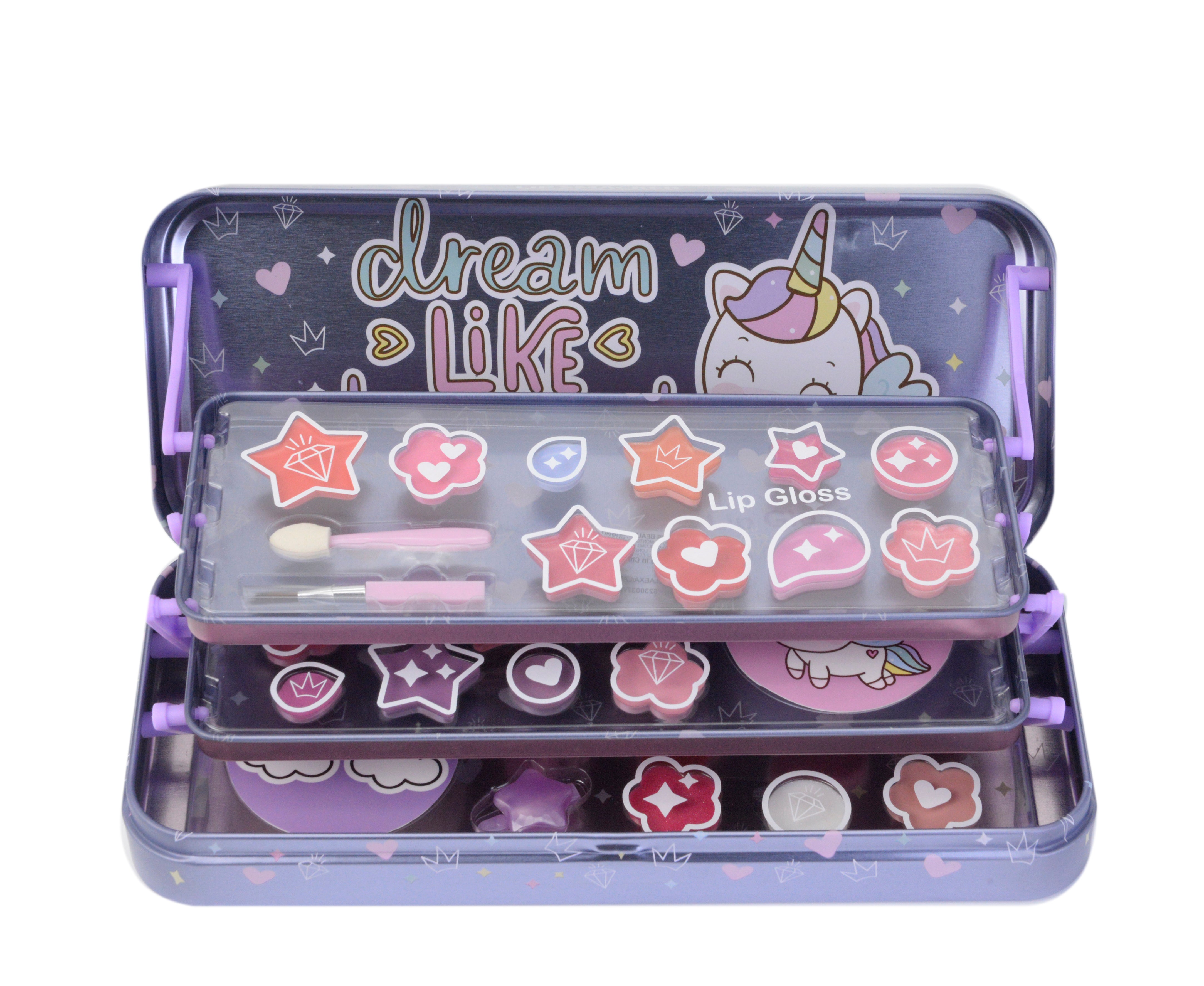 تحتوي العلبة على ألوان شفاه، ظلال كريم للعيون، ملصقات وأدوات تطبيق المكياج، مثالية للعب الإبداعي والتعبير عن شخصية الطفل بأمان.